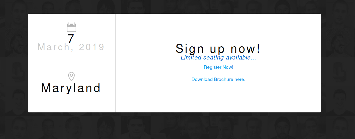 The website issue took much more work. Many hours were dedicated to researching successful seminar websites to decide on the perfect design. Eventually it was decided that a single page app (SPA) would be best. This would allow us to put everything important front and center, keeping the website tight and extremely focused.